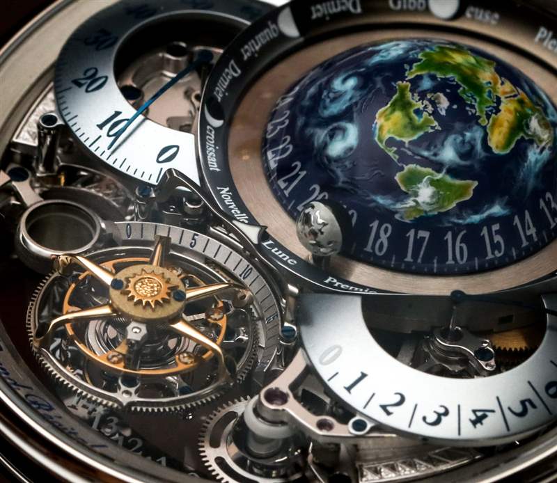 与其他同类时计的情况一样,手表内部的机械机芯和表盘之间没有明显的区别。两者都连接在一起,因为刻度、刻度盘和其他指示器直接构建在机芯本身上。除此之外,播威 Récital 22 Grand Récital 还大量使用手工精加工、雕刻和绘画。半成品的地球仪展示很漂亮,而且是手工精心绘制的。绘画过程中使用的最好的视觉技巧是夜光珐琅漆的应用。播威过去曾尝试过这种类型的发光涂料,并取得了巨大成功。您可以在这篇文章中看到一些图像,说明在 Récital 22 Grand Récital 的表面已适当地充入足够的光线后,表盘上会在黑暗中发光。大多数具有这种传统风格和复杂性的时计都没有那种类型的“灯光显示”来与它的主人分享。话虽如此,告诉时间的系统并不完全是发光的。手表仅以 24 小时格式显示时间,小时是夜光的,但不是逆跳分针。