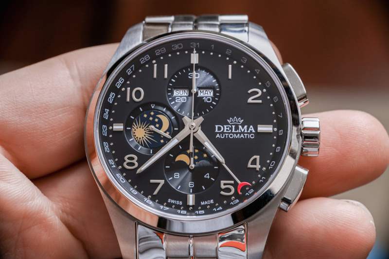 像Delma这样的手表品牌最适合手表消费者,他们不那么追求大公司的名字,而更多地追求专注于特定形式或风格的产品。这家总部位于瑞士的公司更多的是以优惠的价格提供瑞士手表体验,而不是尝试新的设计和美学。这使得大多数 Delma 时计在外观上都很保守,该品牌可能认为这有助于他们吸引休闲的高端手表爱好者。Delma Klondike Moonphase 是该品牌对这个问题的回答;“我们如何制作带有 Valjoux 7751 机芯的手表?” 结果是一个设计大杂烩,主要从正装时计世界中汲取灵感,创造出一款具有大量运动元素的大型手表。