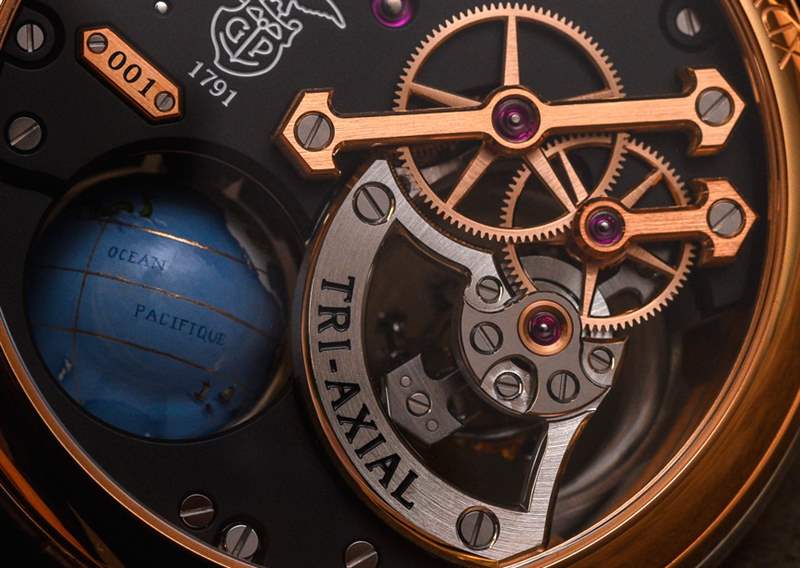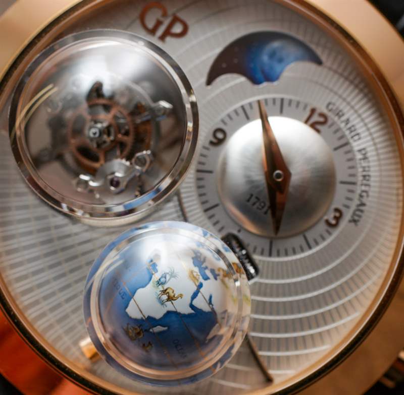 芝柏 ( Girard-Perregaux ) 将这个小型手绘地球仪(大到需要蓝宝石水晶中的气泡)描述为 17 至 18 世纪地图的缩影。这在制图界是一个相当大的时间跨度,但我认为即使是品牌也可以同意,当时像 Girard-Perregaux 三轴天文馆这样的时计会让人感到非常自在。