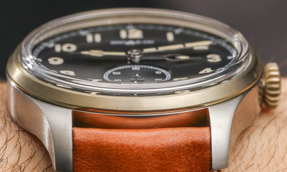 戴在手腕上的万宝龙 1858 自动双时腕表的尺寸为 44 毫米宽和 12.3 毫米厚(防水深度仅为 30 米)。主表壳为拉丝钢,而表圈和表冠为青铜——这种材料会随着时间的推移而产生古铜色。青铜在过去几年一直是一种时尚材料,它与指针和时标上的发光体的陈旧外观相匹配,它在这样的手表中的整合非常巧妙。万宝龙将这款腕表与舒适的“适合时代”、“陈年小牛皮”表带搭配,采用迷人的干邑色。