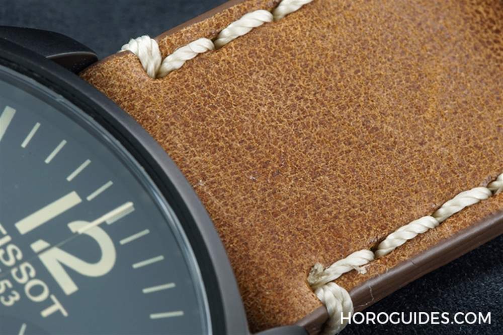 原色牛皮表带饰有车缝线,再加上牛皮的颗粒让表带更有Vintage的复古味。