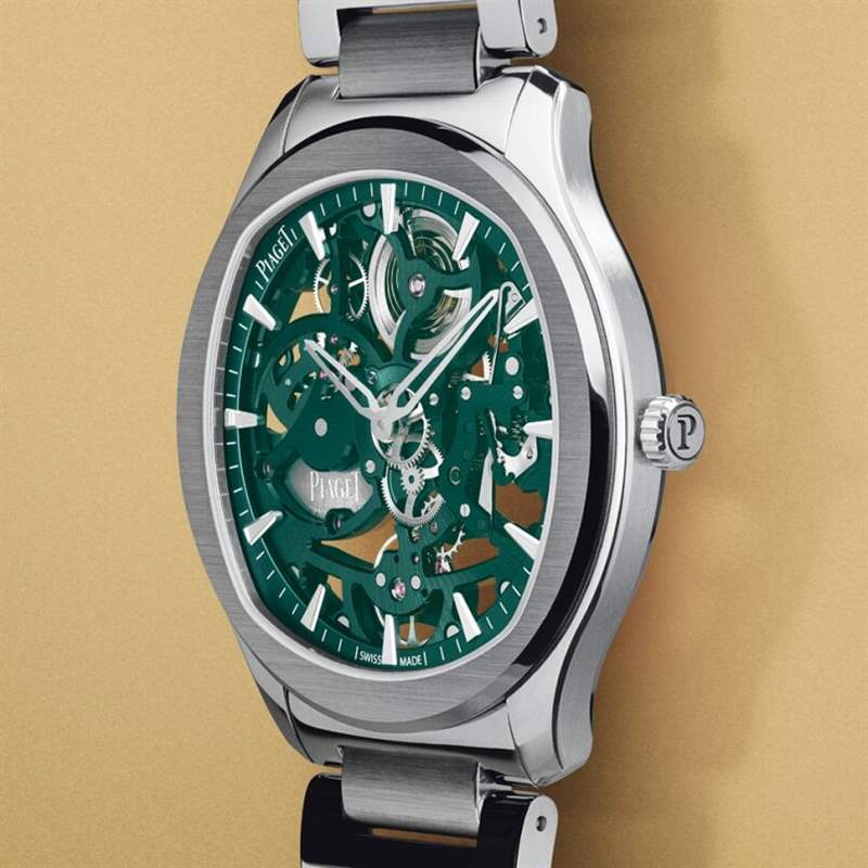 为了成功制造这枚Piaget Polo Skeleton,伯爵的设计师和工程师研制的1200S1超薄自动上链镂空机芯,厚度纤薄至2.4mm,配备镌刻了伯爵家徽的偏心式自动摆陀,佩戴者可随时观赏机芯的运作。而机芯组件与绿色表桥营造出抢眼的色彩对比,加上伯爵将表盘与机芯雕琢到极致精髓,进一步将复杂的机械结构展现出来。不得不提的是腕表拥有超薄的42mm精钢表壳,厚度仅6.5mm,上手轻巧易衬,外表亦高贵优雅。除了有打磨得顺滑亮丽的精钢链带,腕表也附送多一条同色系的鳄鱼皮带,透过快拆表带系统让用家自行更换,衣着搭配更显灵活多变。