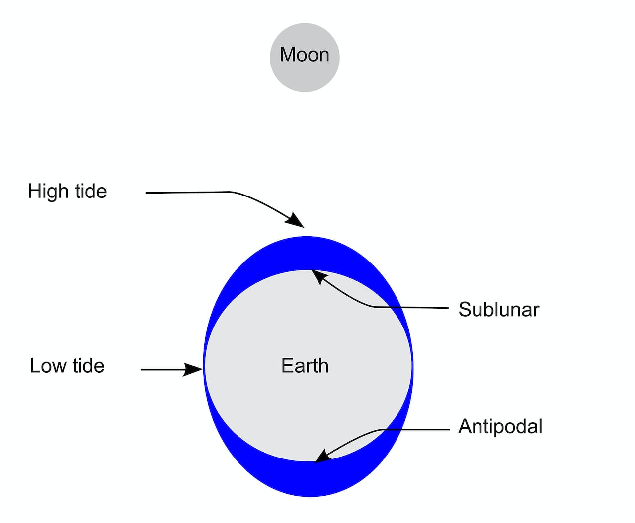 示意图显示了相对于月球位置的潮汐隆起。图片来自维基共享资源。