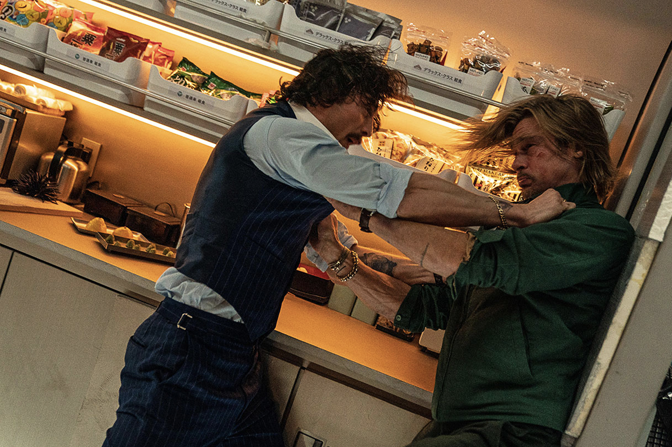 橘子(亚伦·泰勒-约翰逊饰)在子弹头列车中迎战瓢虫(布拉德·皮特饰)。图片,索尼/哥伦比亚影业