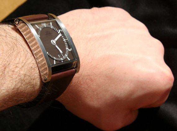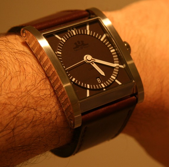 方形表壳宽 38 毫米,从表耳到表耳高约 50 毫米。方形会让它感觉比实际更大,这对于这样的案例来说是一件好事。整个表壳是弯曲的,因此它更好地贴合一个人的手腕。Cameo的酷之处在于整个表壳都是弯曲的,而不仅仅是背面。因此,它非常舒适(而且好看)。我会考虑将表耳集成到表壳结构中,表壳侧面有大型固定螺钉,这是整体设计的一个显着特征。棕色皮革表带与表盘颜色的情绪相得益彰,让我想起了Bell & Ross BR01腕表上的表带。表耳处的表带宽 30 毫米,最小点逐渐变细至 20 毫米。表带比您预期的要厚一些,但我很欣赏这种增加的重量。有人评论说,这是一款非常“看起来很男性化的手表,没有鲁莽”。将肩带固定在一起的是一个带有双按钮释放的折叠式金属扣。表带可轻松调整,适合任何手腕。诱惑实际上包括一个更大的带端,用于更大的手腕。有趣的是,在我狭窄的手腕上,我以最小的设置佩戴较小的表带。一个奇怪的点是刻有诱惑标志的方向和表扣上的签名。它看起来是颠倒的,至少从我习惯看到它的方式来看是这样。也许这是故意的,或者Temption的雕刻供应商搞砸了。真的没什么大不了的,但我认为值得指出。至少可以说,它增加了性格。总的来说,我不得不承认,拍手和表带设计得很好,搭配得很好——它们是手表的强项。