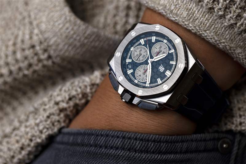 然而,今年 AP 推出了皇家橡树离岸型的新版本,均采用自产机芯。这些手表采用 42 毫米表壳,小表盘位于 6、9 和 12,日期位于 3(1993 年原始型号的布局),或 43 毫米表壳,带有 3、6、9 子表盘布局,日期为 4:30。43 毫米型号使用 Code 11.59 计时码表中首次引入的 Calibre 4401 计时机芯,42 毫米型号使用 4404,基本上是 4401,但经过重新配置以支持原始 Offshore 型号的子表盘和日期布局。