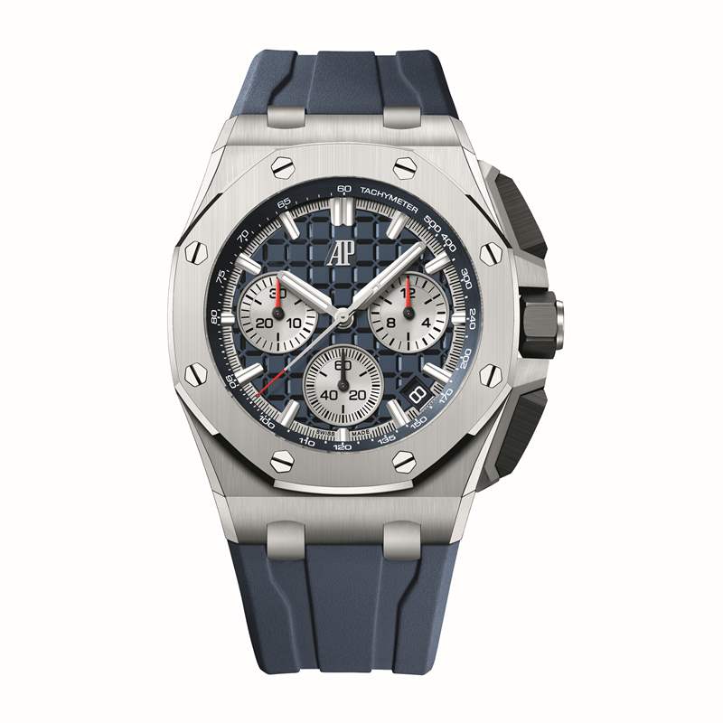 43 毫米计时码表偏爱较暗的中性色调,表盘采用黑色、烟熏棕色、蓝色或灰色。总共有五个版本——两个钢和两个钛,第三个是 18 克拉玫瑰金,它们都具有相同的校准。在 Code 11:59 系列中首次亮相的 4401 自动飞返计时机芯。每款腕表均配备可互换橡胶表带,并根据型号另配一条橡胶、小牛皮或鳄鱼皮表带。