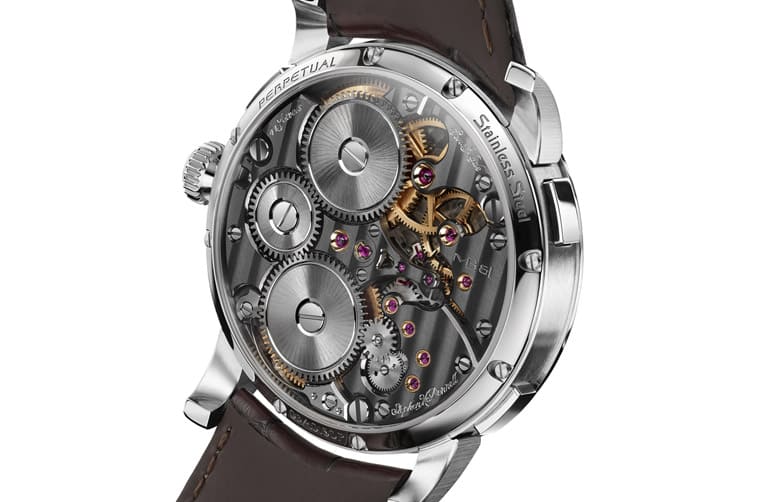 ▲表背露出MB&F历时三年开发的手上链机芯,其由北爱尔兰制表师Stephen McDonnell协力开发,零件数超过500枚,机芯本身以手工打磨修饰的基板、桥板等皆散发出高级制表的工艺水准。