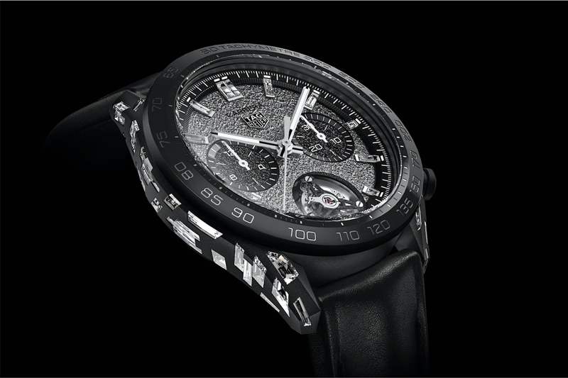 Carrera Plasma 陀飞轮的更新包括带宝石镶嵌的铝制表链,延伸到表壳之外并延伸到表链上,以及表圈上的额外钻石。TAG Heuer(泰格豪雅)与总部位于日内瓦的公司 Salanitro 合作,该公司是宝石镶嵌领域的领导者,包括百达翡丽在内的高端制表商经常向其求助,负责切割和镶嵌过程的各个部分,但独特的单石钻石表冠在内部切割、安装和粘合。