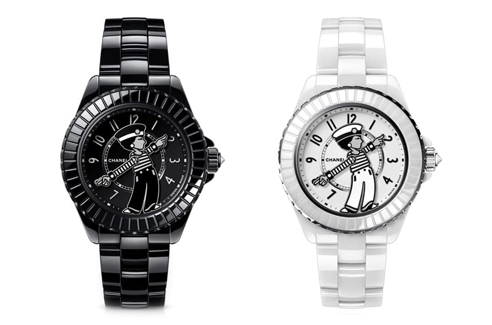 Mademoiselle J12 La Pausa腕表Only Watch特别版延续2022年~2023年品牌推出的同款作品设定,面盘安排了Q版的香奈儿女士图案并化作时、分指针的作用,Q版图案的服装灵感来自香奈儿女士拍摄于蔚蓝海岸的La Pausa自家别墅花园的一张照片,照片上她身穿条纹上衣搭配钮扣裤装,香奈儿精心替腕表上的Q版图案加上海军帽点缀,展现出一派率性自在的个性。