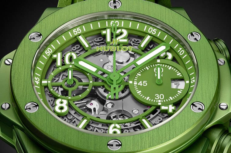 手表的面盘延续Unico家族的传统采用开面设计,不过宇舶向来注重手表造型的一致性,因此包括面盘外围刻度圈、小表盘、时标,以及指针都也都全是绿色调,在机芯零件的铁灰色映衬下强化了视读清晰性,而包括指针与时标也都涂上了夜光物料,所以在暗处要判读时间也不会受影响。