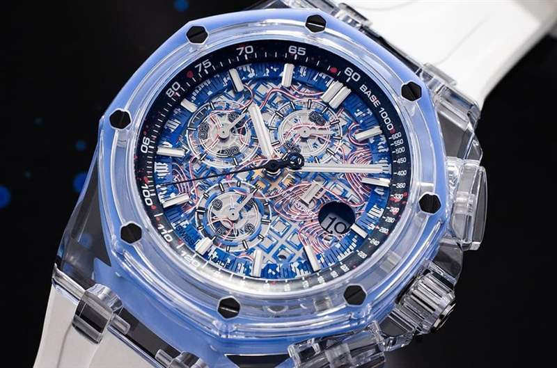 Azure Blue的表背透明底盖边缘一样呈现淡淡的蓝色,并用黑色螺丝牢牢固定,透明底盖边缘拥有和测速计刻度一致的黑底红点设计,至于底盖上这回并没有多加其他图案或色彩,让佩戴者可以好好欣赏手表搭载的3126/3840自动机芯,改装表品牌并未特别修改机芯零件,所以这部分能够体现AP原厂的制表工艺本色。Azure Blue仅限量推出10只,要价141,500欧元(约合台币482万),想入手代价可不低。