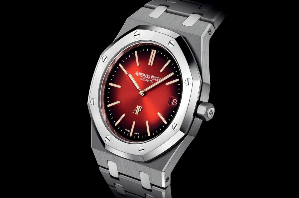 ▲16202XT的表壳、链带零件为钛金属制成、表圈与錬节连接零件则是用BMG材质打造,后者采用抛光处理为皇家橡树Jumbo超薄表少见设计,包括渐层红色面盘也是系列中少见的尝试。