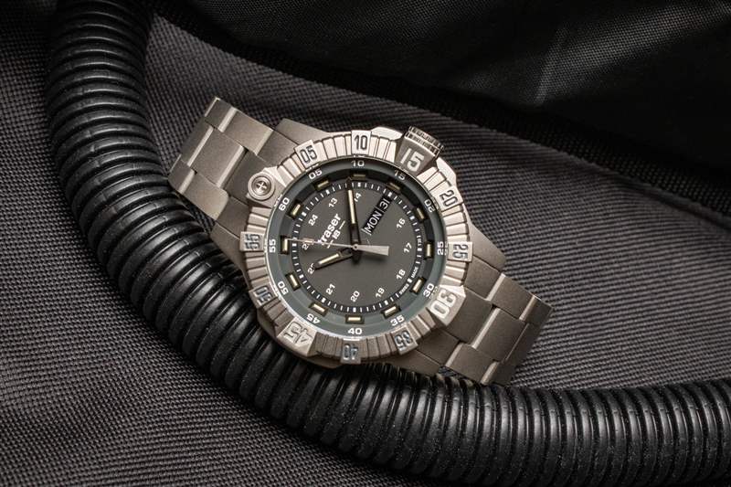 Traser P99 T Tactical 的表耳至表耳尺寸为 54 毫米,客观上使其成为一款相当大的腕表,尽管其全钛结构有助于将重量降至最低,并确保其在手腕上保持令人惊讶的易于管理。带有激光蚀刻雕刻的实心旋入式表背与 3 点钟位置的带标志旋入式表冠配合,有助于保证 200 米的充足防水性能,而手表的表盘则由平面防反光蓝宝石保护。水晶。水晶周围是一个 60 击双向计时表圈,具有经过时间刻度和深层纹理设计,可实现最大抓握力。虽然不可否认的是,边框非常容易抓握,但其动作存在少量间隙,而且由于旋转边框所需的实际力量并不是特别强,