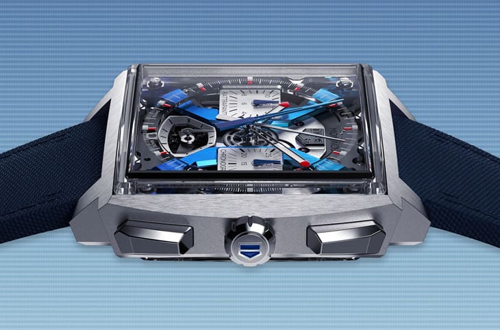 有了 Carole Forestier-Kasapi 的大师级工艺加持,为 Monaco 双追针计时码表奠定了坚实基础,使其机芯极具收藏魅力。但机芯工艺的进步并非该表定价飙升的唯一原因。Monaco 双追针计时码表有红色和蓝色两种版本,表的正反两面均覆盖蓝宝石水晶,带有立体切面的蓝宝石大面积覆盖手表正面,营造出前卫风格。据悉,光是制作这款表的镜面(包括合成蓝宝石、切割、抛光以及加上涂层等),就至少需要花费四个月时间。