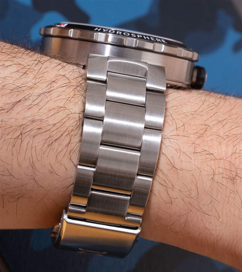 作为一款潜水表,Hydrosphere 防水深度达 250 米,并内置自动排氦阀。表壳较大,宽 45 毫米,但由于相对较窄、粗短的表耳,它的磨损较小。更重要的是,由于表耳放置在表壳的底部,Hydrosphere 感觉就像骑在手腕上,这提高了舒适度,并使整体尺寸更适合较小的手腕。表壳厚度也接近 15 毫米,采用圆顶蓝宝石水晶表镜。它不会感觉太厚,但这本身就不是一块小手表。尽管据说表壳有 45 毫米宽,但表圈本身还是有点宽,大约 47 毫米宽。再说一次,这是一款更大的时计,但它的佩戴比它的体积建议的要小一些。广告讯息广告信息结束