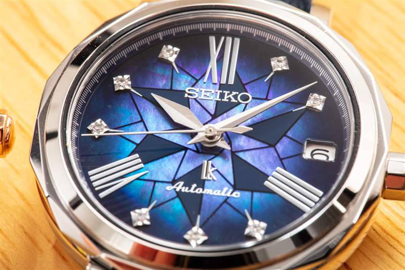 12 小时标记中有八个镶嵌小钻石。缺少一个小时标记,以便为日期窗口腾出空间,而其他三个小时标记则采用了风格化的罗马数字。凭借棱角分明、有力的双手,Lukia 的脸庞有趣地融合了大胆(几乎是男性化)的线条,与天生女性化的颜色、纹理和装饰形成鲜明对比。易读性强,彩色珍珠母贝的强大外观有助于手表引人注目和有吸引力——这是所有高端手表都应该具备的。