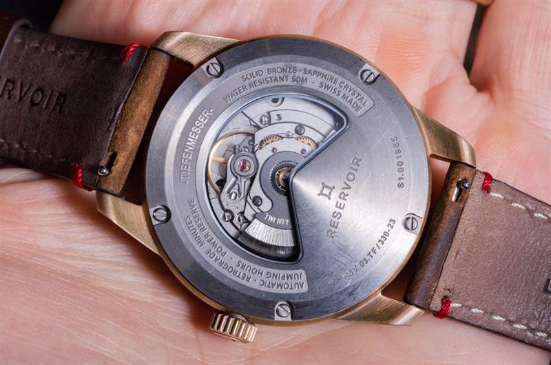 瑞士制表商Reservoir于 2019 年发布了其以潜艇设备为灵感的 Tiefenmesser 腕表的有吸引力的版本,被称为参考 RSV03.TM/330-23 Reservoir Tiefenmesser Bronze。“Tiefenmesser”在德语中是“深度计”的意思,这正是这款帅气时计表盘的灵感来源。潜水艇和其他 20 世纪早期至中期仪器上的白色表盘工业压力或深度计的图片是该品牌该系列的直接美学模拟,该系列当前的主题是围绕独家逆跳分钟和跳跃构建钟表 -小时机械装置用于为其手表提供动力。
